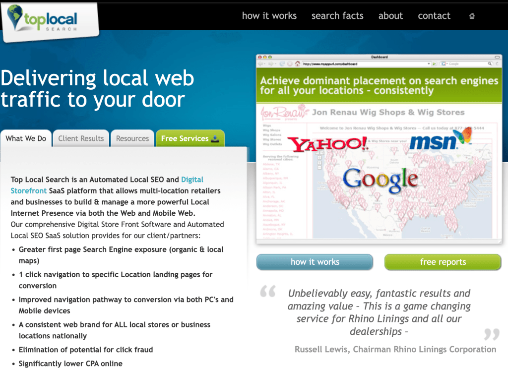 Bill had developed a local search software, Top Local Search, which was nothing short of revolutionary—it just needed the right marketing and sales strategy to reach hundreds or even thousands of multi-location businesses. We developed the marketing materials and began the challenging task of selling it. Penetrating the defenses of gatekeepers at large enterprise companies was daunting; we were pioneers, and many of these businesses were completely unaware of what our software could do for them.