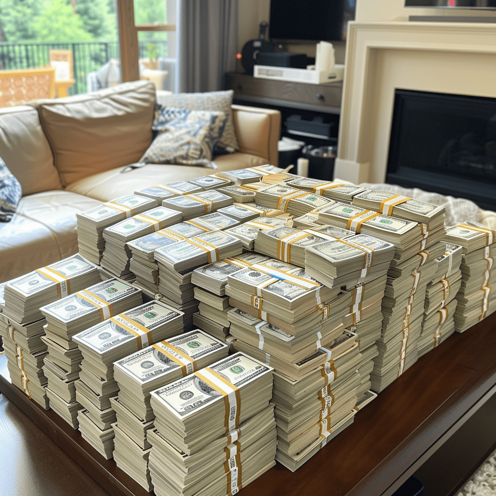 This AI-generated image represents a stack of cash valued at $350,000, illustrating the average daily revenue generated by the SEO team at Overstock. CEO Patrick Byrne had asked us to show him the money, and we did. The drive and ambition of our team were evident, and while there was keen competition among the leadership, it spurred us to reach greater heights.